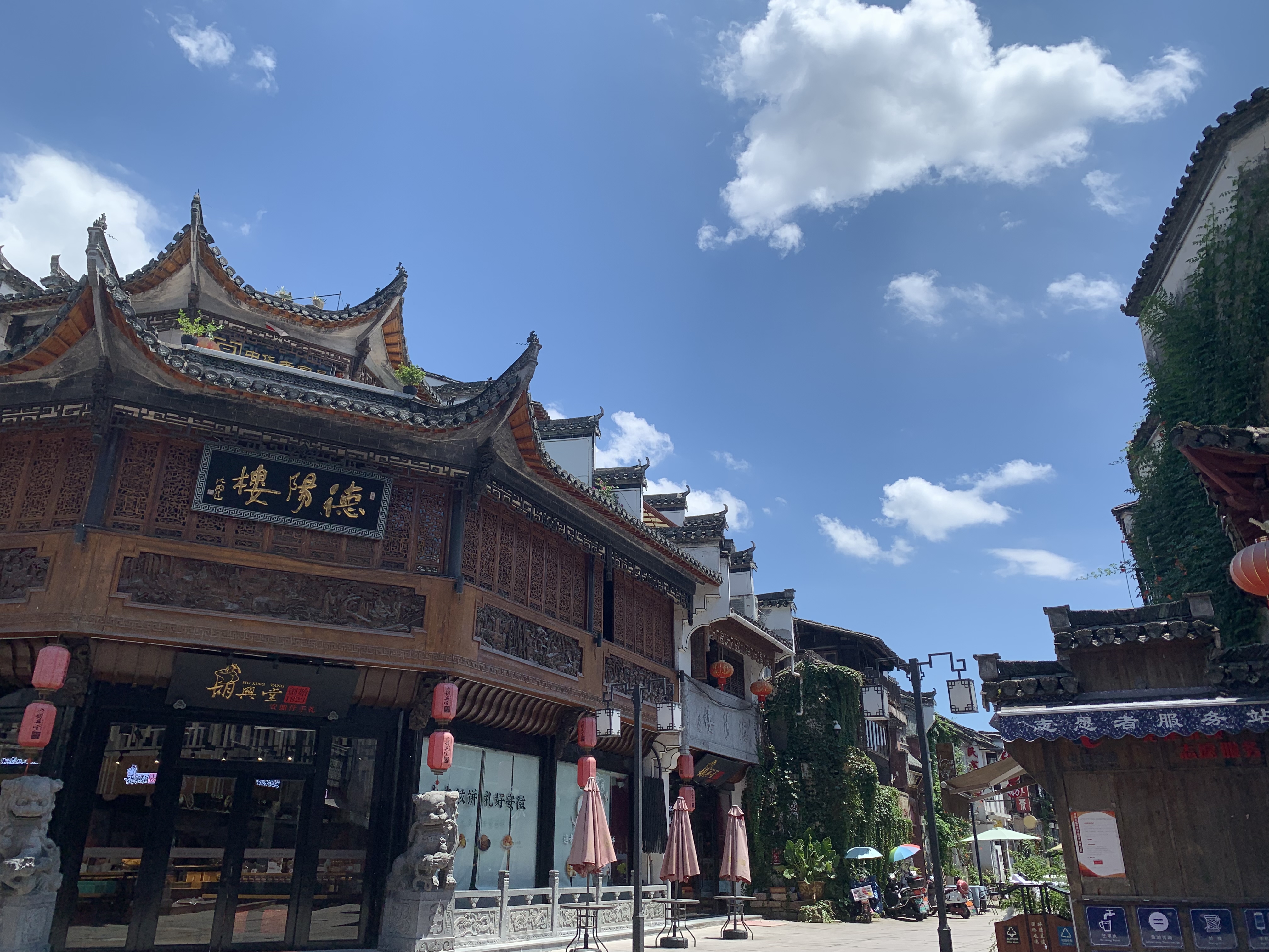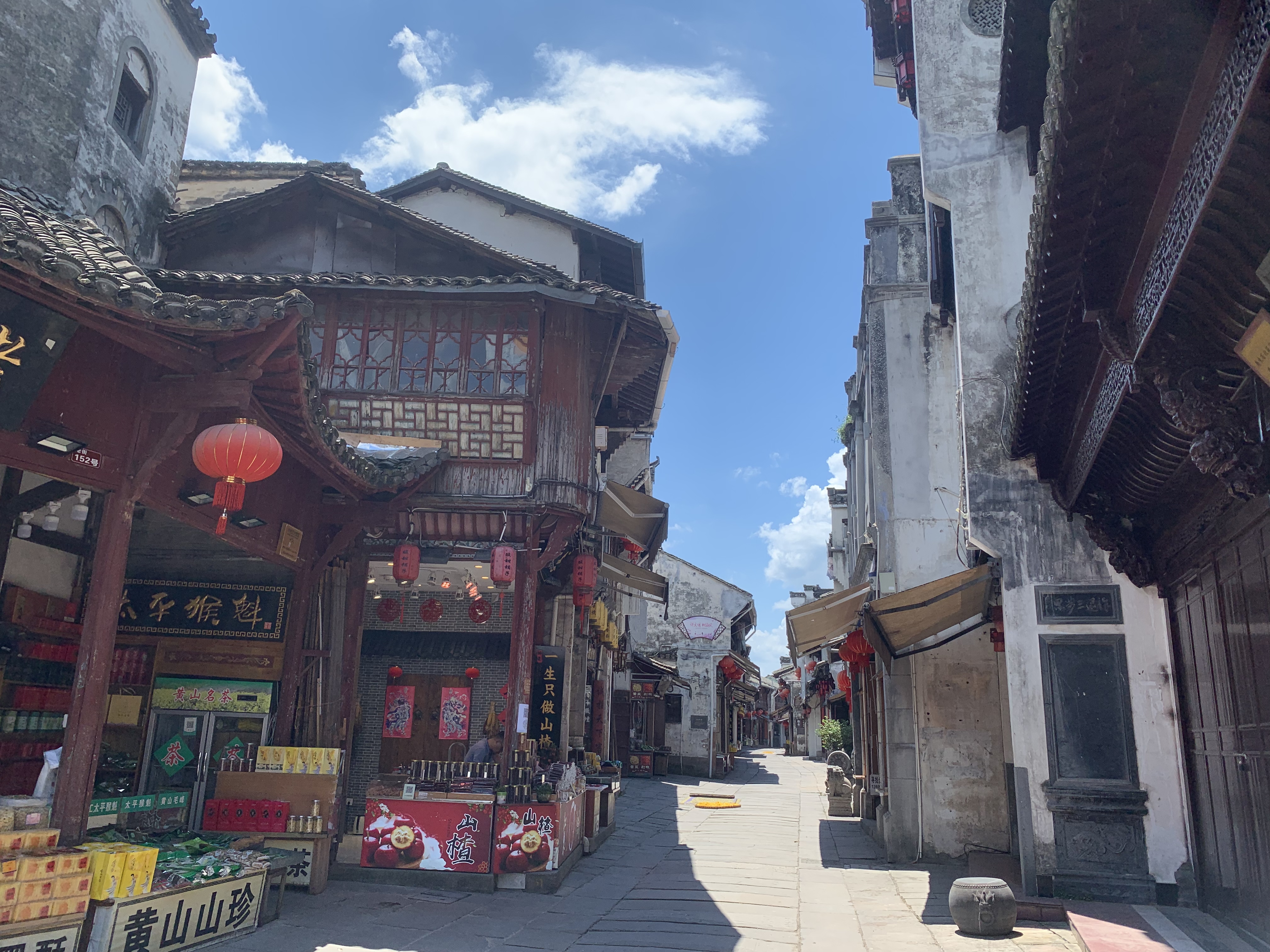 經(jīng)過3個(gè)多小時(shí)的車程,我們首先來到的是屯溪老街。屯溪老街座落在安徽省黃山市屯溪區(qū)中心地段,北面依山,南面傍水,全長1272米,由不同年代建成的300余幢徽派建筑構(gòu)成的整個(gè)街巷,呈魚骨架形分布,西部狹窄、東部較寬。因屯溪老街坐落在橫江、率水和新安江三江匯流之處,所以又被稱為流動(dòng)的"清明上河圖",是中國保存最完整、最具有南宋和明清建筑風(fēng)格的古代街市,也是中國"全國重點(diǎn)文物保護(hù)單位"。